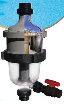 Incoming water enters 16 hydro cyclones tangentially, generating a strong centrifugal effect. The sediment is spun out to the hydro cyclone's wall, and then spirals down to the sediment chamber. Yhe filtered water migrates towards the centre of the hydro cyclone where the flow reverses and spirals upwards through the outlet. Accumulation of sediment can be visibly monitored through the MultiCyclone's clear sediment chamber. The MultiCyclone is easily cleaned by opening the valve. Only 15 litres of water is discharged to cleanse the MultiCyclone.