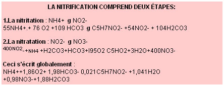 • Lorsque la température le permet, la nitrification de NH4+ en NO3- contribue à appauvrir le milieu en oxygène dissous.