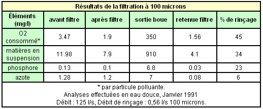 Elle est principalement adaptée pour un filtrage s’étendant de 100 à 5000 microns. Elle est constituée d’un tapis filtrant homogène, en acier inoxydable, composé de grilles juxtaposées et fonctionnant en circuit continu. Ces grilles comportent un tamis renforcé (type ARMEDIA). L’appareil est incliné à 40° par rapport à l’ horizontale. Les déchets déposés sur le tapis par le courant d’eau, sont tout d’abord emportés vers la partie supérieure du filtre; arrivés à son faîte, ils sont ensuite décolmatés et projetés dans un système de récupération à l’aval, à l’aide d’une rampe de lavage sous pression. Ce type d’ appareil est actuellement largement utilisé par de nombreux industriels et pisciculteurs, entre autres, qui ont pu résoudre leurs problèmes de filtration à l’aide de mailles très fines. Nous donnons, dans le tableau ci-après quelques résultats d'analyses qui ont été effectués à partir d’une grille à tapis filtrant à mailles de 100 microns.