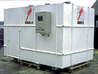 Photo : le Feeding Compact est une unité complète qui comprends des silos et un système de alimentation. L'aliment est acheminé jusqu'aux cages par des tuyaux à l'air libre