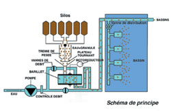 Stockage centralisé de l’aliment et transfert direct sur les bassins Une installation type comporte :