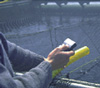 Ce distributeur de granulés est un appareil simple et robuste qui sert à réguler la direction de la distribution d'aliment dans les cages. Une construction sphérique ingénieuse rend possible la distribution des granulés dans toutes les directions désirées dans la cage. Photo : un distributeur de granulés installé sur une cage.