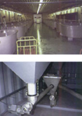 Ce système a été conçu pour contrôler le flux de données relatives à l'alimentation, aux mesures et alarmes. La ferme entière peut petre télécommandée. La base de données et l'interface utilisateur peuvent être changées en fonction des besoins. Pour les grandes sociétés, plusieurs fermes peuvent être gérées avec le même système. (schéma) Les dispositifs comportant une gestion centralisée et des silos près des bassins