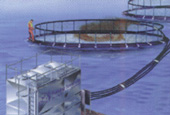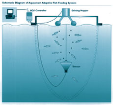 Le système adaptable d'alimentation contrôle automatiquement les distributeurs et adapte de façon précise la quantité d'aliment distribuée à l'appétit du poisson. Le détecteur très avancé, le système de communication, le logiciel permettent à une ferme d'être entièrement gérée et contrôlée d'un ordinateur central.