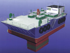 La barge conique a été conçue pour que les silos eux-mêmes servent d'élément de flottaison principal, ce qui offre l'avantage d'avoir la majeure partie de la structure immergée.Le module lui-même flotte à la manière d'un iceberg. L'accès vers l'espace machines et au système de transport à partir des sortie de silos se fait par le centre du module.
