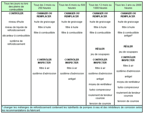 Programme d'entretien des groupes électrogènes Le programme d'entretien suivant n'est qu'un exemple et ne peut en aucun cas être considéré comme adapté à tous les appareils. De plus, des contrôles et réglages spécifiques sont à effectuer après les 50 premières heures de fonctionnement. Il convient donc de se reporter à la notice d'utilisation et d'entretien de son propre groupe électrogène. Contrôle régulier
